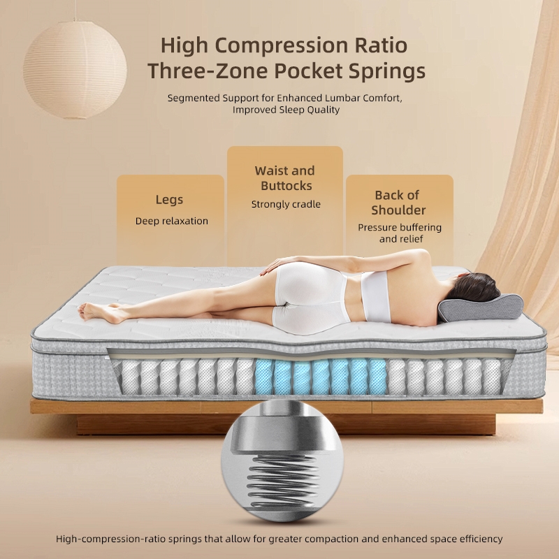 Soutien segmenté pour un confort lombaire amélioré, une meilleure qualité de sommeil, des ressorts à taux de compression élevé qui permettent un plus grand compactage et une meilleure efficacité spatiale