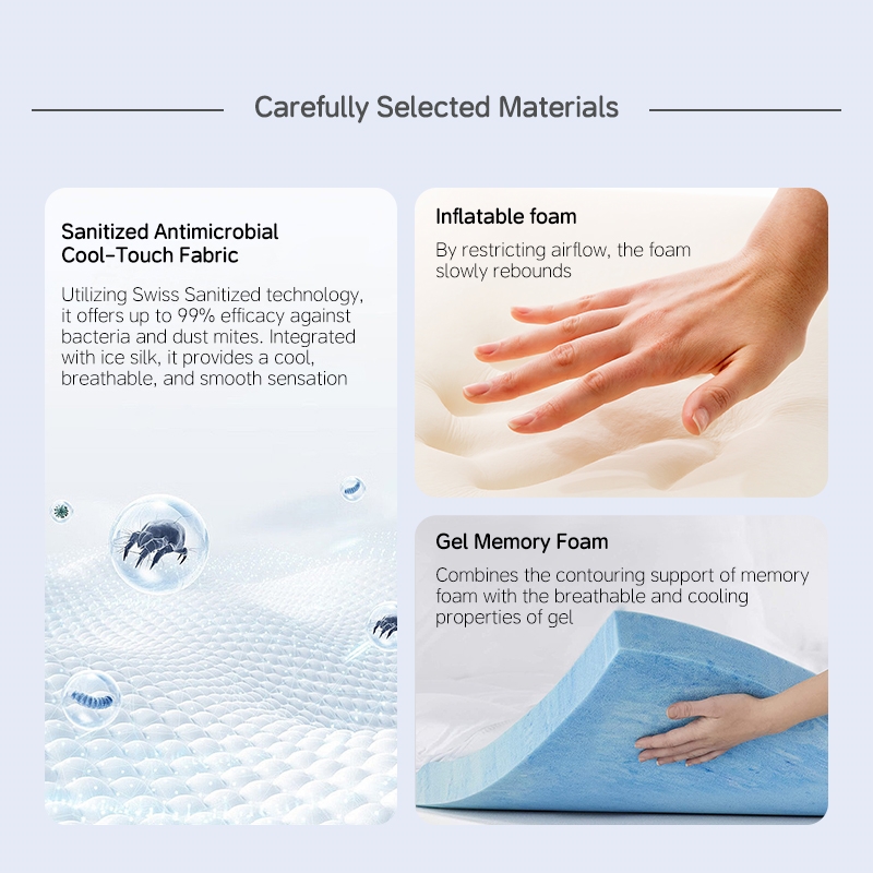 Utilizing Swiss Sanitized® technology, it offers up to 99% efficacy against bacteria and dust mites. Integrated with ice silk, it provides a cool, breathable, and smooth sensation